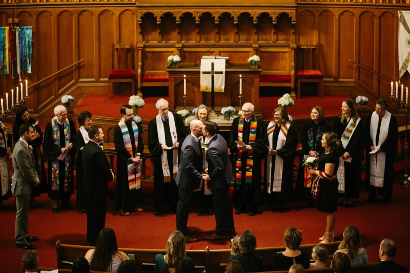 In February 2019, a year before Rodrigues officiated Parker and Phillip’s wedding at the Durham church, United Methodist delegates from around the world gathered at a conference in St. Louis to decide whether or not to uphold the denomination’s “Traditional Plan,” which bans same-sex weddings as well as the ordination of non-celibate LGBTQ clergy.