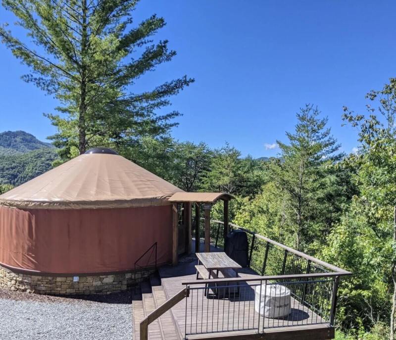 Well, traditionally, a yurt is a portable tent used by nomadic groups in Central Asia, but in this Bryson City destination they come with a king-sized bed, central heating, a full bath, a kitchen, and wifi.