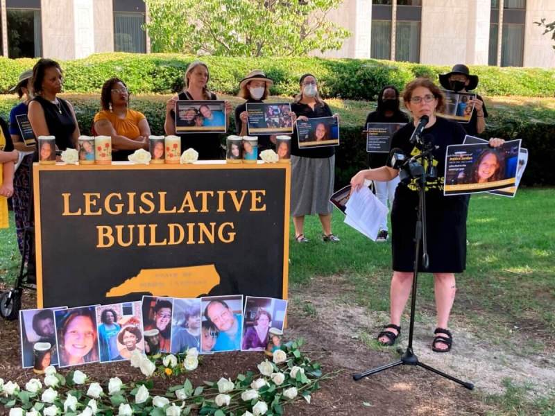 Rebecca Cerese, a policy advocate at the North Carolina Justice Center, speaks at a vigil in front of the North Carolina Legislative Building in Raleigh, N.C., Tuesday, July 26, 2022, to remember people lacking Medicaid coverage or insurance who have died. Cerese and other speakers urged lawmakers to pass a law so North Carolina accepts federal funds to expand Medicaid coverage to hundreds of thousands of additional adults (AP Photo/Gary D. Robertson)