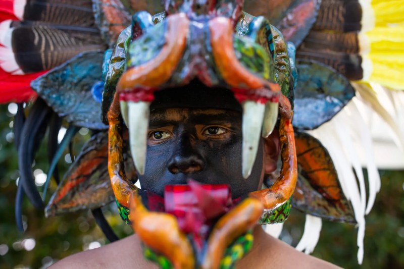 Irvin Casarrubias prepares to perform as part of the Danza Guerreros de Quetzalcoatl de Durham at the Cameron Art Museum in Wilmington, North Carolina on September 24, 2023. The intergenerational group celebrates traditional Aztec dance and helps to preserve Mexican culture as its members put down roots in the communities they now call home. Casarubbias, now 18, has been dancing since we was five-years-old.