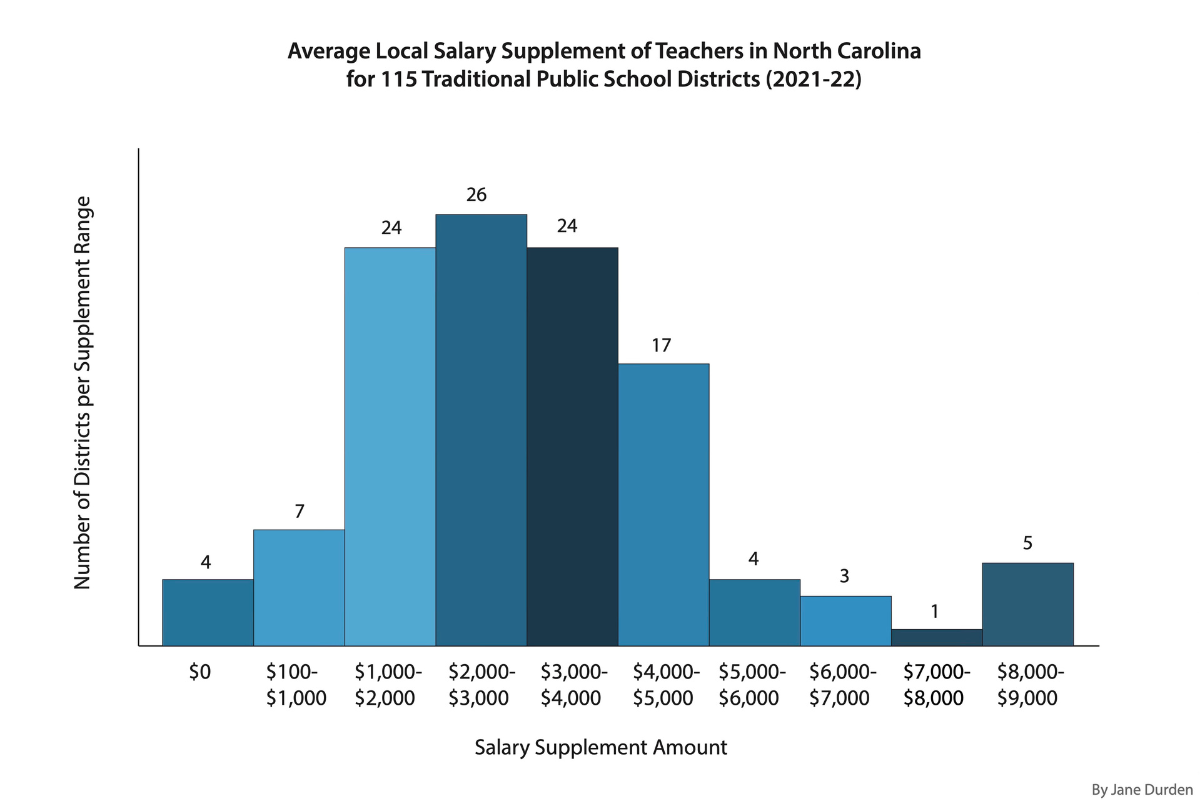 That number can increase based on bonuses for classroom achievement and local supplements that range widely between districts. The average supplement is just over $5,000, but some counties don’t have a local supplement at all.