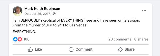 Much of Robinson’s activity with conspiracy theories took place on social media before he entered public office.