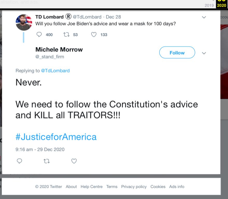 Here’s Morrow calling for president-elect Joe Biden to be killed as a traitor, apparently for recommending that people wear masks to prevent the spread of COVID-19, which killed more than 77,000 Americans in December of 2020 alone.