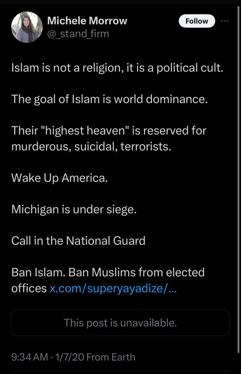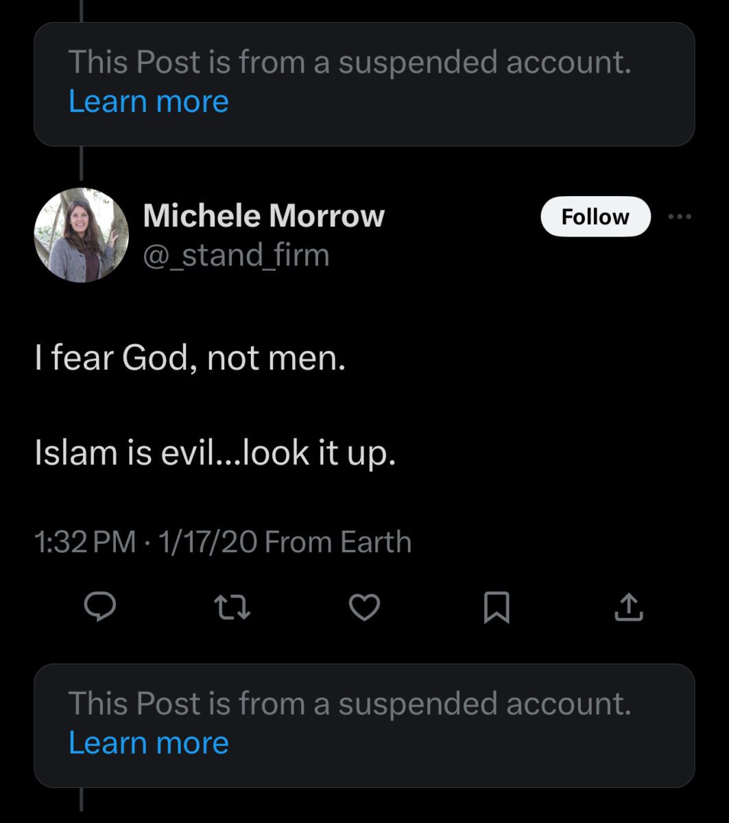 Morrow’s hatred toward those with opposing political beliefs also extends to people who practice religions other than hers. The Twitter account she attempted to remove from public consciousness shows she believes Islam—as in, the whole religion practiced by nearly a quarter of the world’s population and more than 130,000 people in North Carolina—is “evil.”