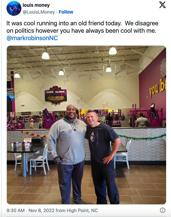 According to Money, Robinson approached him in November 2022 at a Planet Fitness in High Point. The two hadn’t seen each other in at least a decade, Money told The Assembly, but took a photograph together, which Money posted to social media with the caption: “I disagree politically with this guy. However, we have always been cool. That’s Our Lt. Governor who still owes me money lol.”