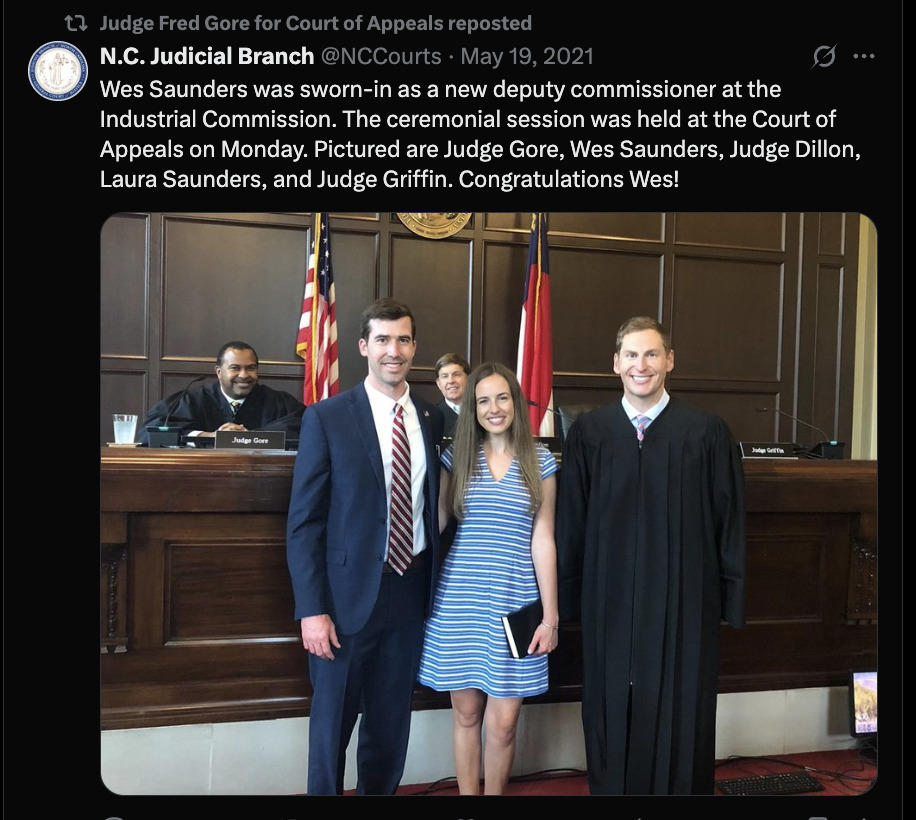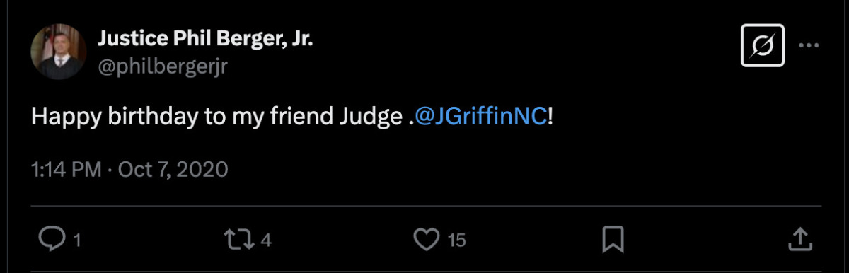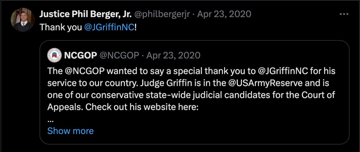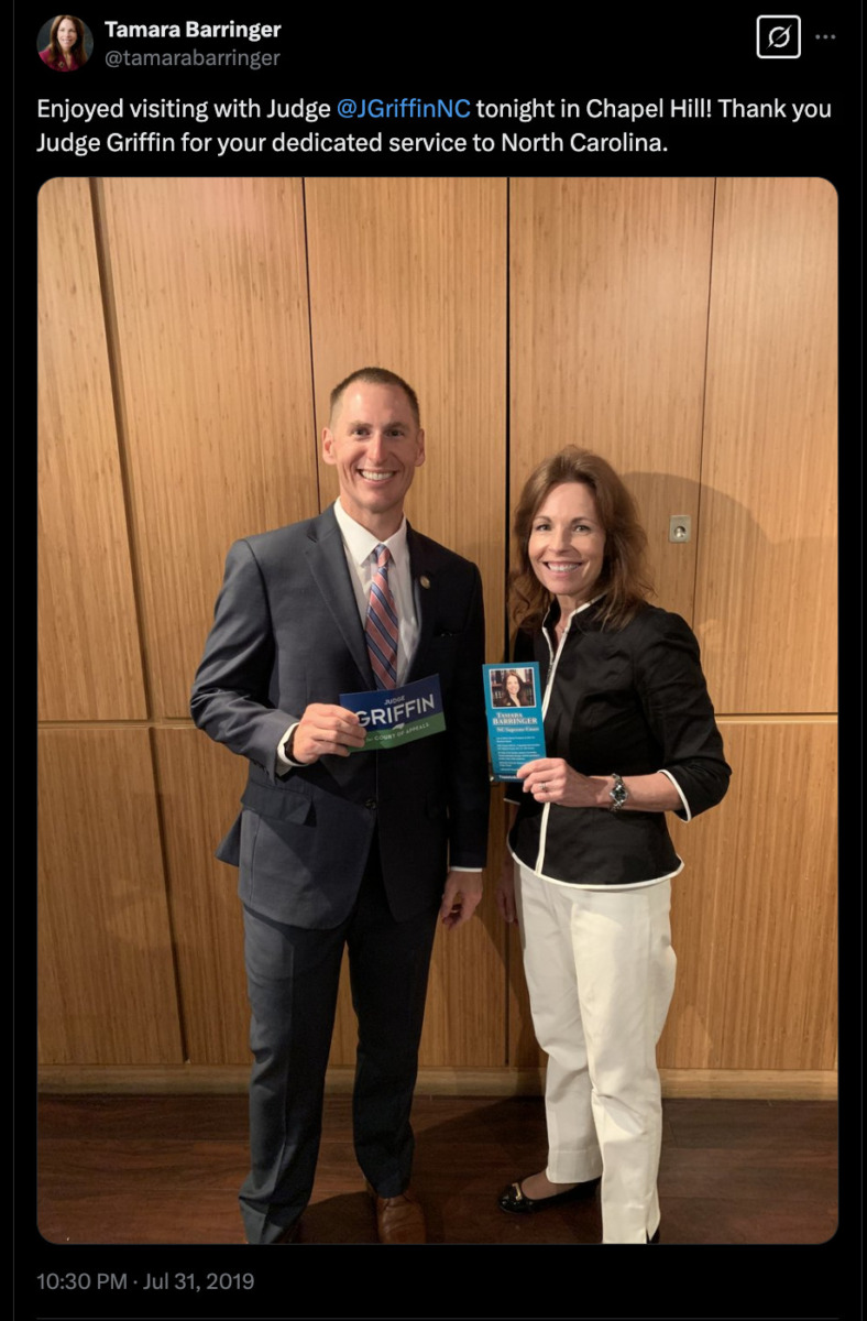 “Enjoyed visiting with Judge @JGriffinNC tonight,” she wrote. “Thank you Judge Griffin for your dedicated service to North Carolina.”