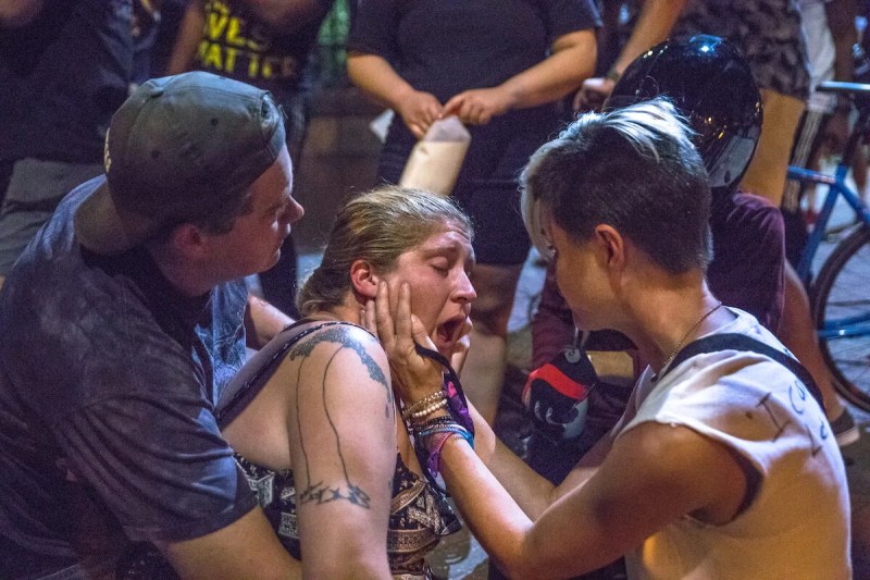 Then two lines of police officers sprang into position, flanking the protestors and sealing off the street. The flanking police and the overhead officers in snipers’ positions hit the crowd with a barrage of flash bangs, tear gas and pepper balls.