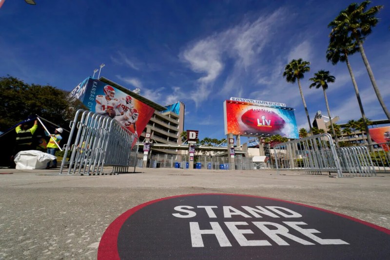 Workers erect a tent outside of Raymond James Stadium ahead of Super Bowl 55 Thursday, Feb. 4, 2021, in Tampa, Fla. (Image via AP/Charlie Riedel)