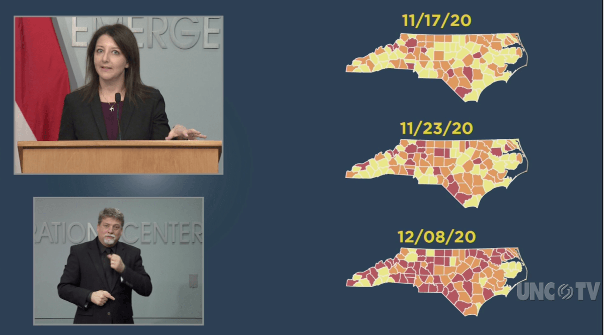 NC is seeing a rapid increase in COVID-19 infections, with half of its counties deemed “critical” by state health agencies. (Image from Dec. 8 media briefing/Sarah Ovaska)