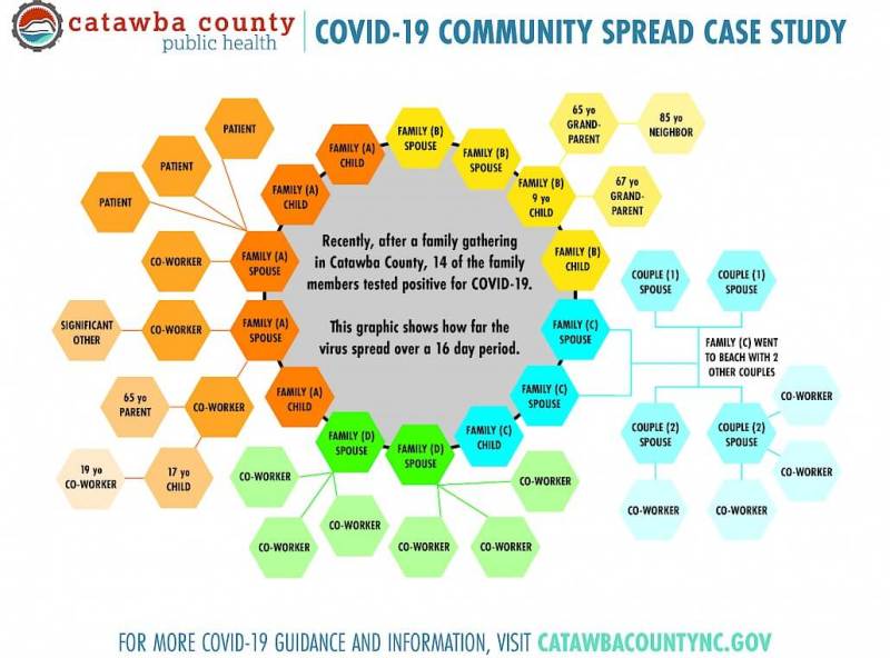In Catawba County, for example, a recent family gathering where no one wore masks sparked a fairly significant outbreak. Fourteen family members left the party with the virus, and within 16 days, it had sickened 41 people in nine different families and eight workplaces.