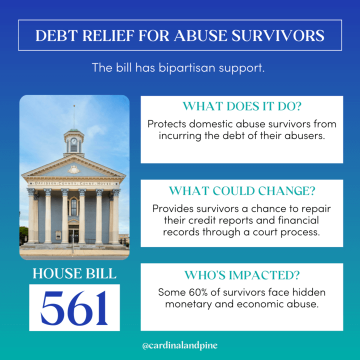 House Bill 561 makes it possible for people who were financially coerced to raise their credit scores, have their debt partially forgiven, and even seek repayment from their abuser. It’s making its way through House committees and we hope to see the House vote on it soon!