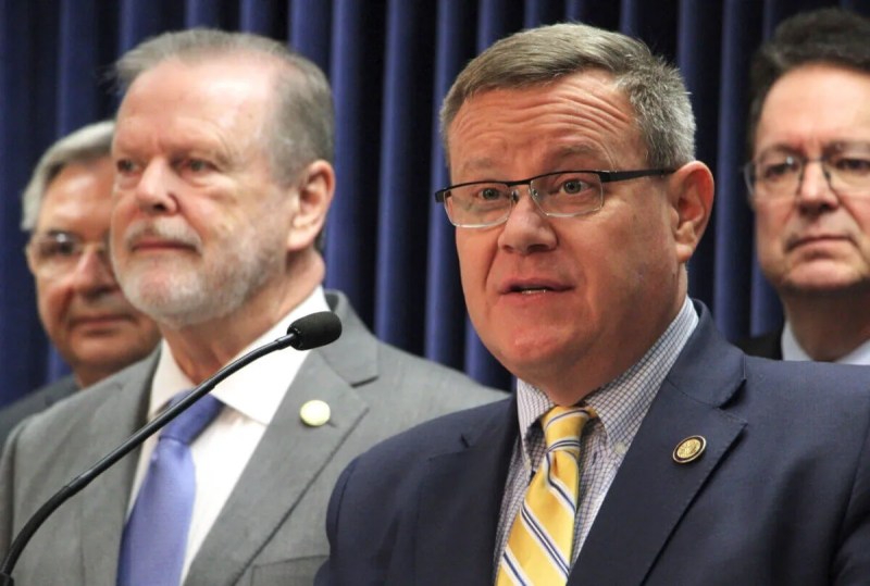 North Carolina House Speaker Tim Moore, center, speaks at a news conference about a Medicaid expansion agreement, Thursday, March 2, 2023, at the Legislative Building in Raleigh, N.C. (AP Photo/Hannah Schoenbaum)