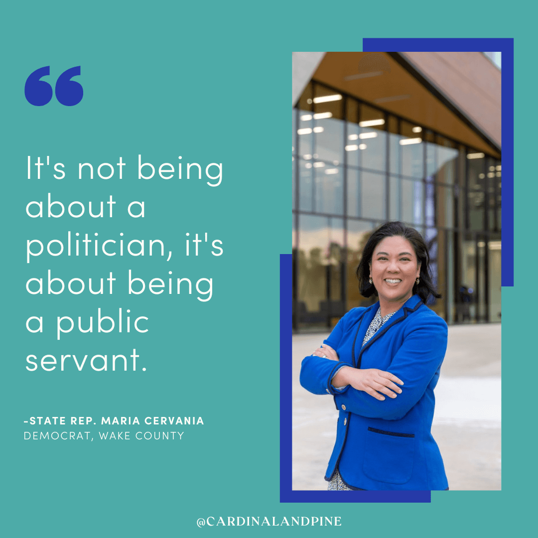Today, we’re publishing our interview with Rep. Maria Cervania, who represents Cary in the state House and previously served on the Wake County Board of Commissioners. Cervania, who is of Filipino descent, is one of the first two Asian-American women ever elected to the state legislature.