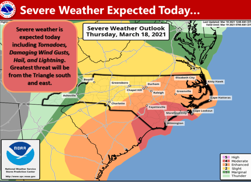 The National Weather Center’s Storm Prediction Center, which ranks the danger of storm systems on a scale of 1 to 5, places much of the state at Level 3 Thursday. Areas south and east of the Triangle to the coast and South Carolina border were at the greatest risk.