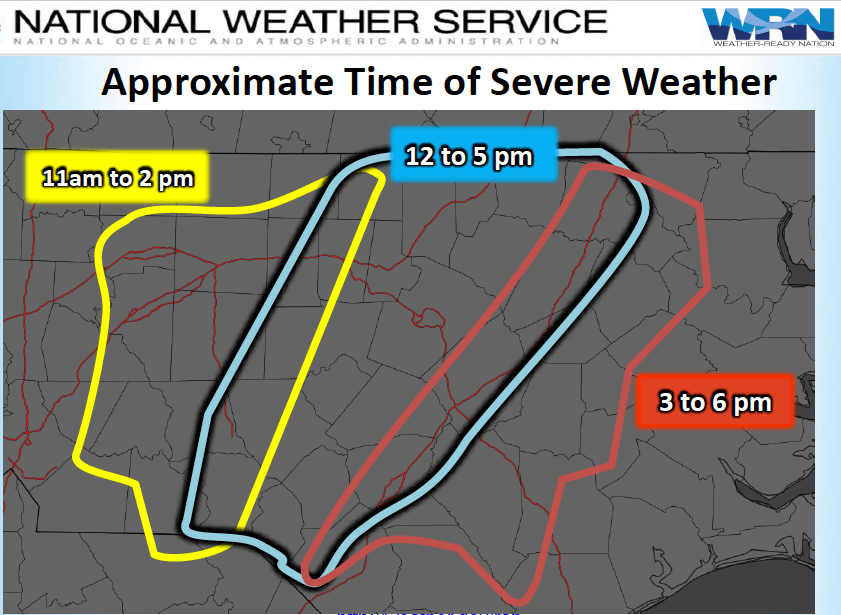 The Charlotte area, Piedmont, Triangle, and much of Eastern North Carolina are facing the biggest risk, with western counties beginning to see bad weather at 11 a.m. The central part of the state will see storms roll in at 12 p.m. Thursday, while 3 p.m. is when east of I-95 should start seeing storms, according to information put out Thursday morning by the National Weather Service.