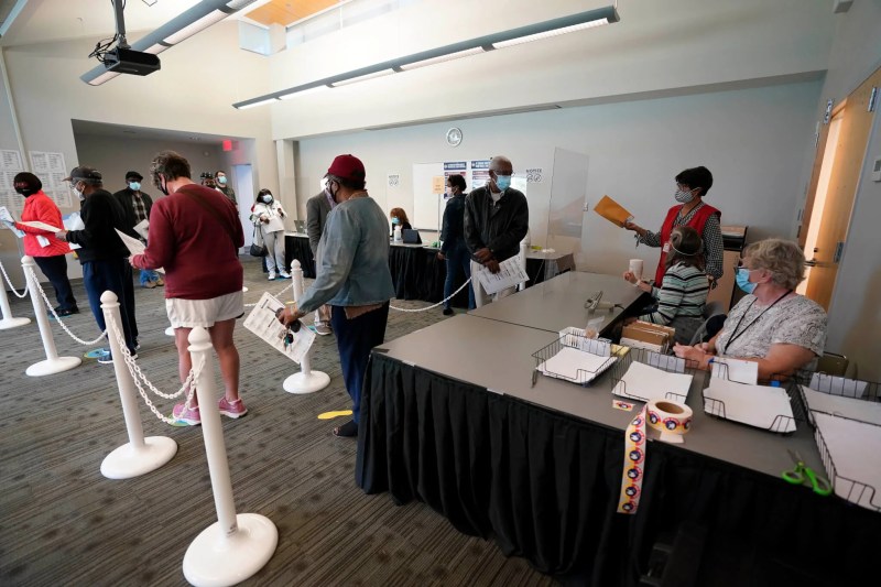 Early voters line up to cast their ballots inside the South Regional Library polling location in Durham, N.C., in October, 2020. (AP Photo/Gerry Broome, File)