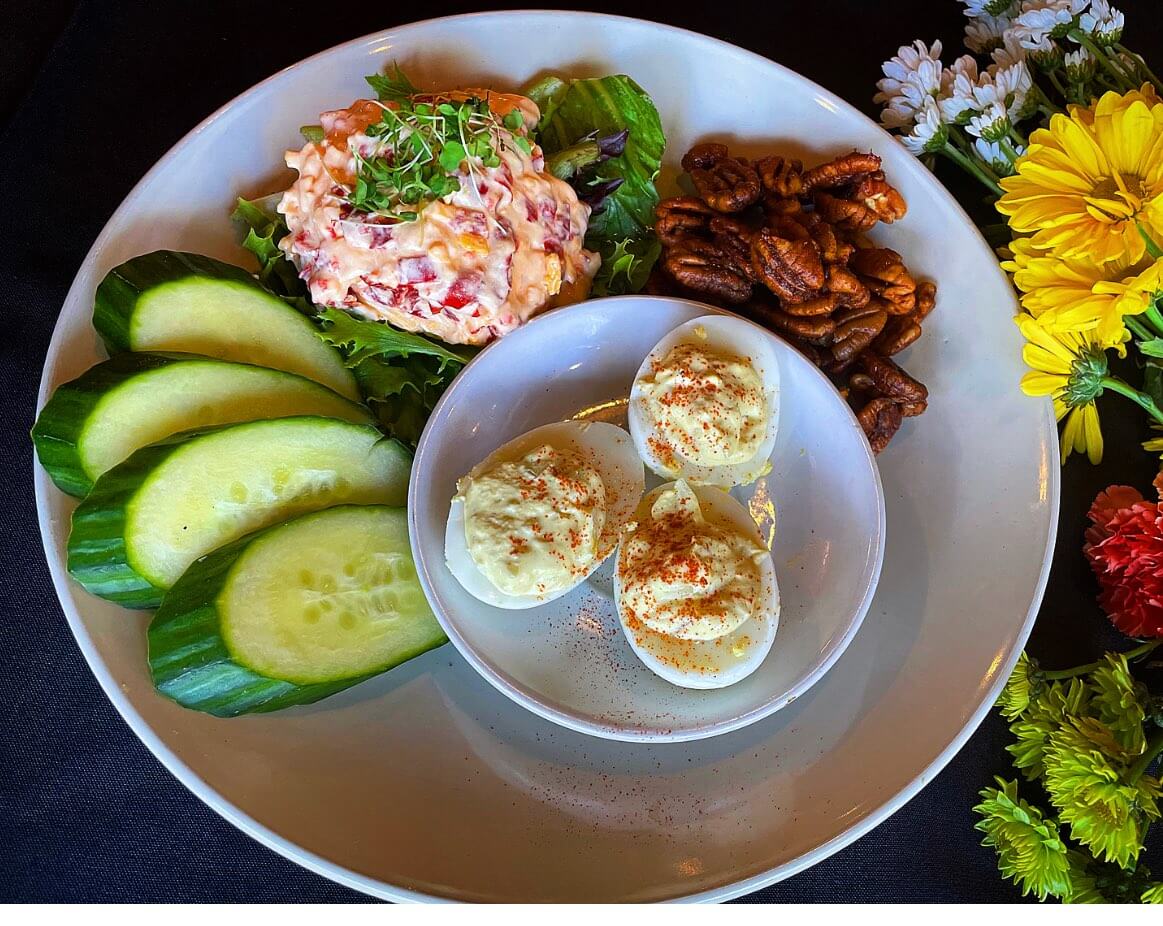 Nothing basic about the pimento cheese options in this downtown Wilmington café. Start with the Southern Canape: pimento cheese (based on the owner’s grandmother’s recipe), cukes, deviled eggs and spiced pecans. The pimento cheese sandwich is chilled and served on warm bread. Pro tip: Sit at the bar and order the martini of the day. 319 N Front St., Wilmington